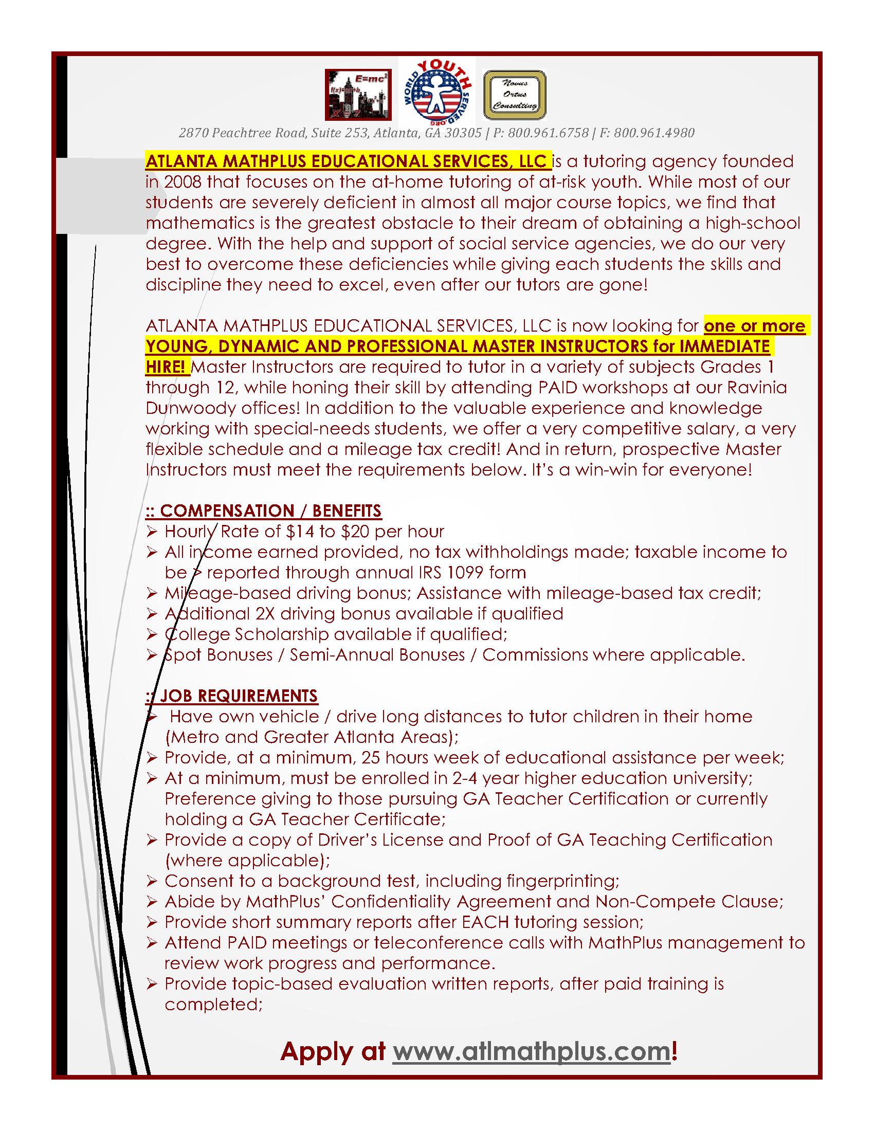 Please send your cover letter and resume to hillside.connection@atlmathplus.net. IMPORTANT: In your email, plese indicate which shift(s) you can be available for.